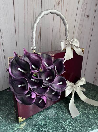 Deep Purple Lilies, satin silver ribbon and rhinestones look as though you are carrying a flower bouquet. The flowers jump off the purse & almost wrap around the side. Mini rhinestones are hand placed on each Lily's Spadex for more bling. Italian Silk Tafeta lines the inside with style. NOTE: Box has been salvaged from a local Miami cigar shop. Some imperfections may be found.